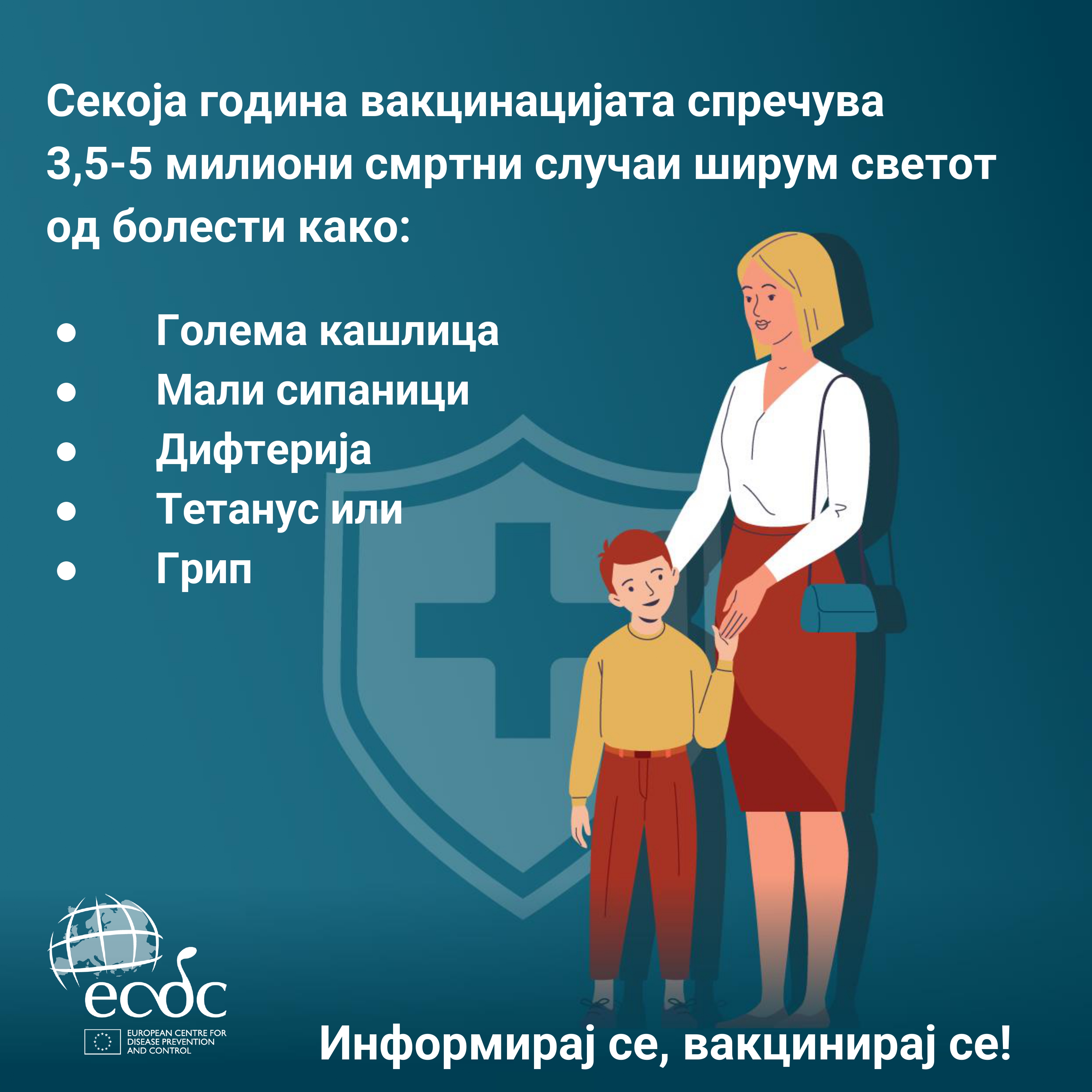 Во 2026 година, Европската недела на имунизација се одбележува од 19 до 25 април под мотото: „Вакцините делуваат – за секоја генерација“. Оваа недела претставува важна можност да се потсетиме дека вакцините се едно од најголемите достигнувања на современото јавно здравје. Тие секоја година спасуваат милиони животи и спречуваат ширење на опасни заразни болести, штитејќи не само поединци, туку и целата заедница преку колективен имунитет.